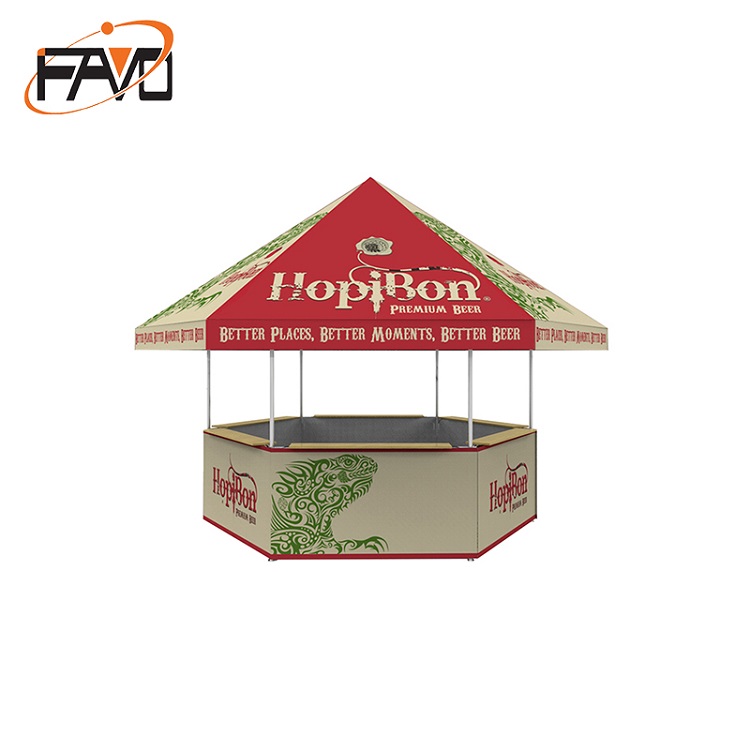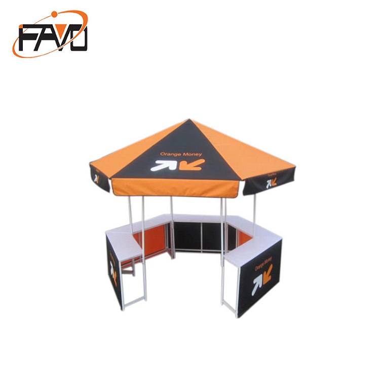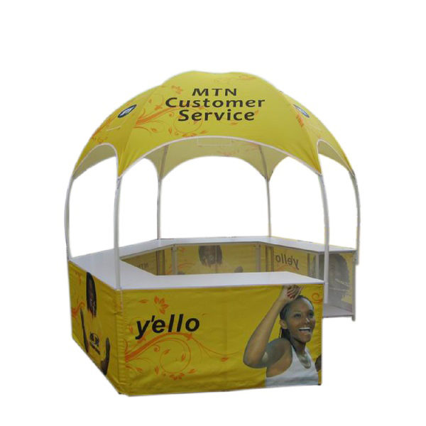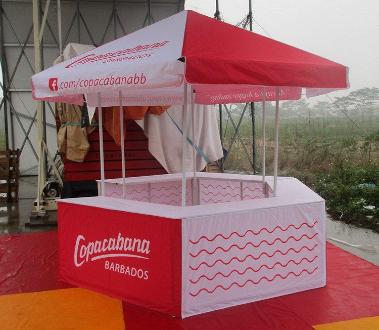 Tent, flags and table cover are used together to be more branding and outstanding.