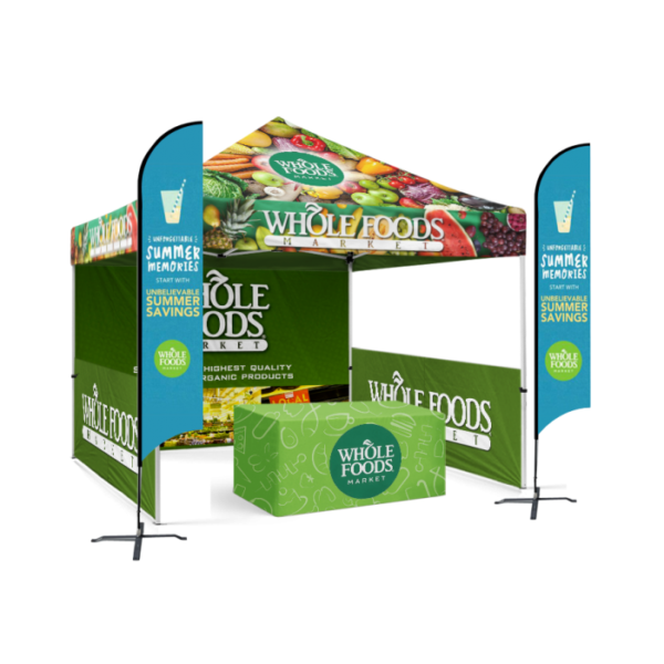 Tent, flags and table cover are used together to be more branding and outstanding.