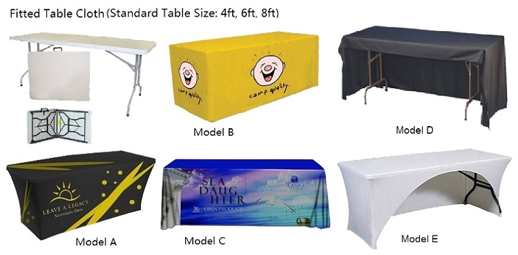 As attached picture we have several different models for the table cloth, kindly please see which model and what size you like? Always the standard table size is 4ft wide, 5ft wide, 6ft wide and 8ft. We also can make the table cloth based on your table’s measurement.