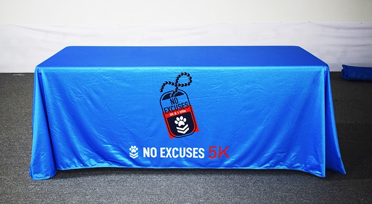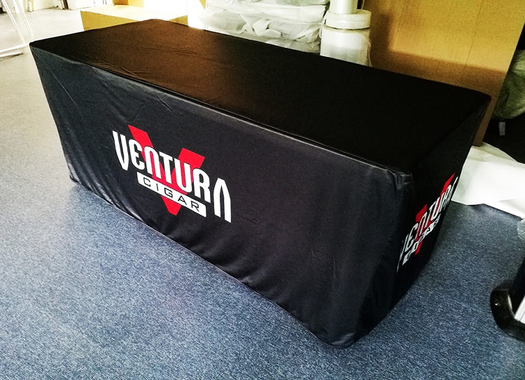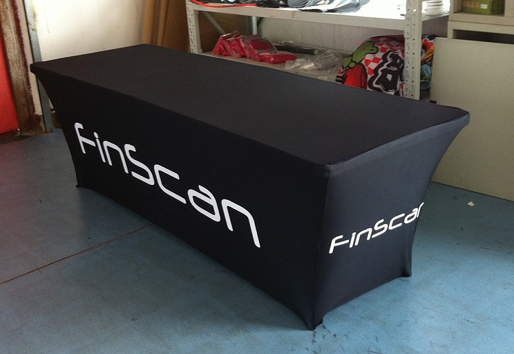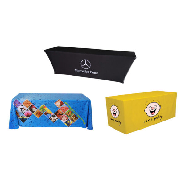 Tent, flags and table cover are used together to be more branding and outstanding.
